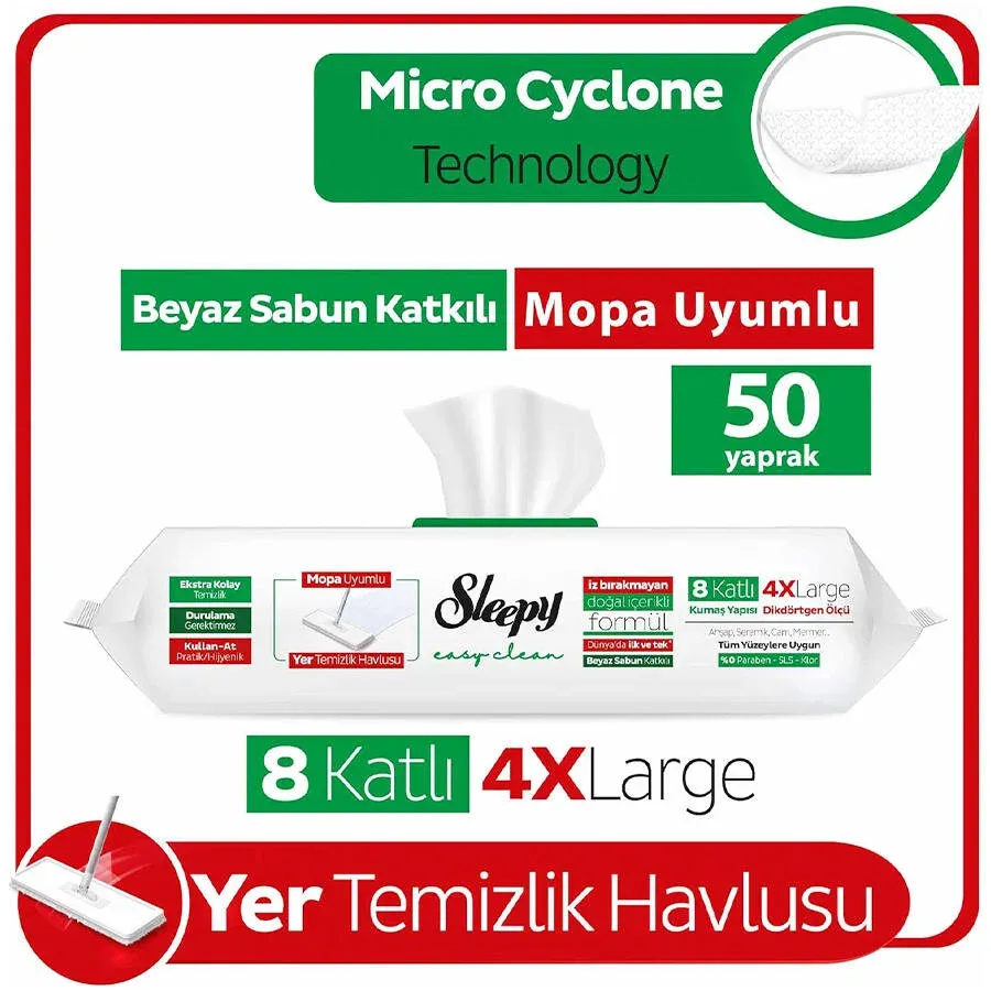 Sleepy Easy Clean Beyaz Sabun Katkılı Mopa Uyumlu Yer Temizlik Havlusu, ev temizliği için pratik ve etkili bir çözüm sunar. 50 yapraklık bu ürün, beyaz sabun katkısıyla zeminlerde derinlemesine temizlik sağlar. Moplarla uyumlu olarak tasarlanan bu temizlik havluları, günlük temizlik işlerinizi kolaylaştırırken hijyenik ve ferah bir ortam yaratmanıza yardımcı olur. Kullanımı son derece basit olan bu havlular, leke ve kirleri hızlıca temizler ve ardından yüzeyde hoş bir koku bırakır. Özellikle yoğun yaşam tarzına sahip kişiler için ideal olan bu temizlik ürünü, zaman tasarrufu sağlarken etkili sonuçlar sunar.